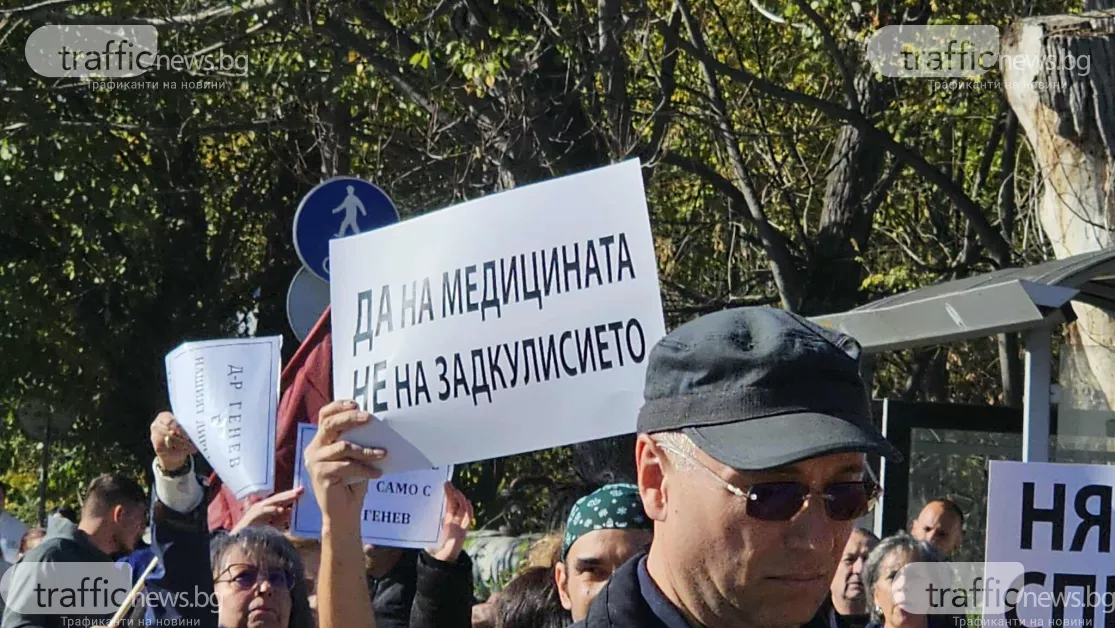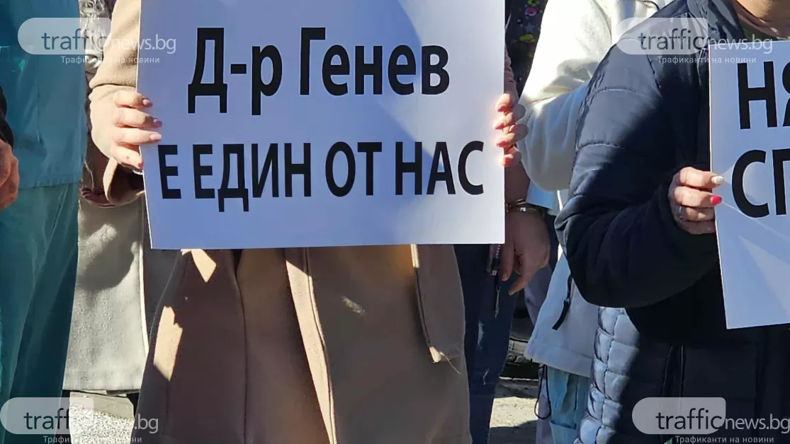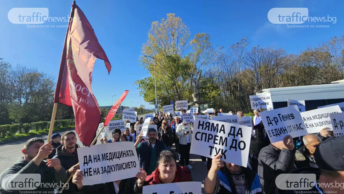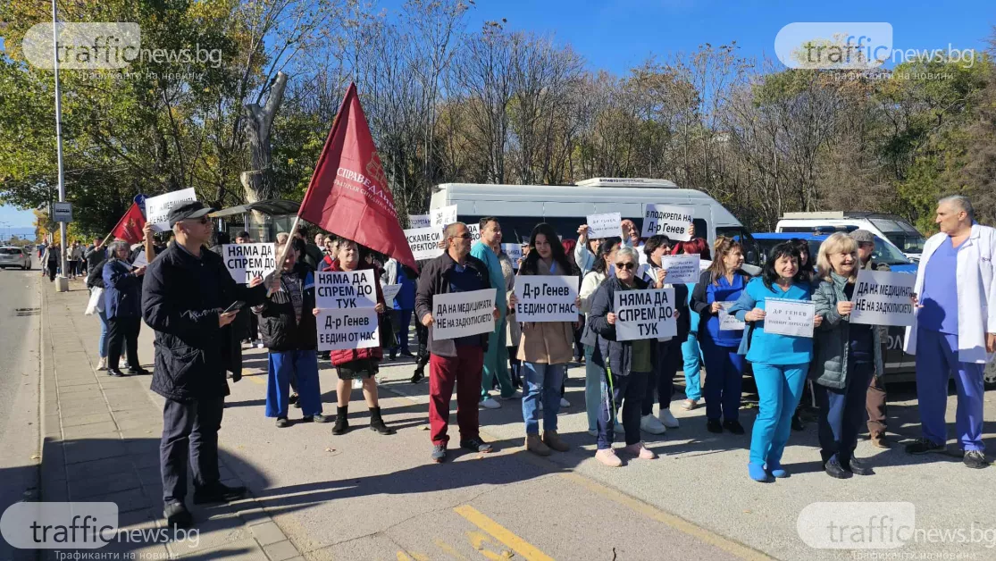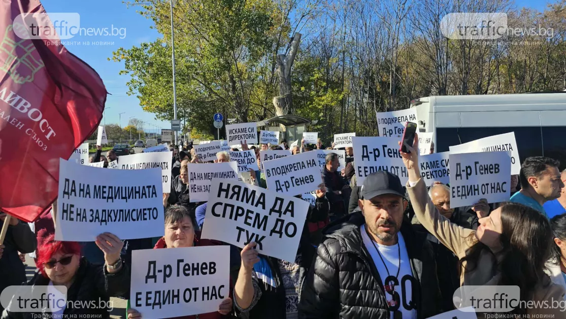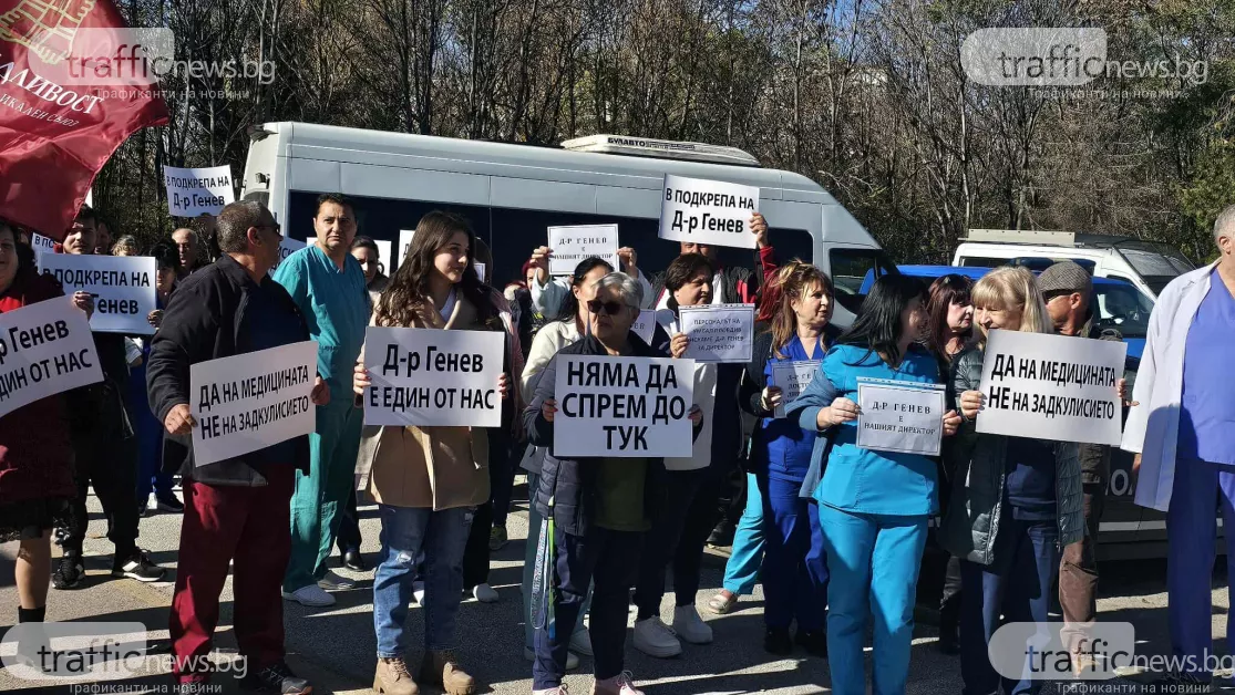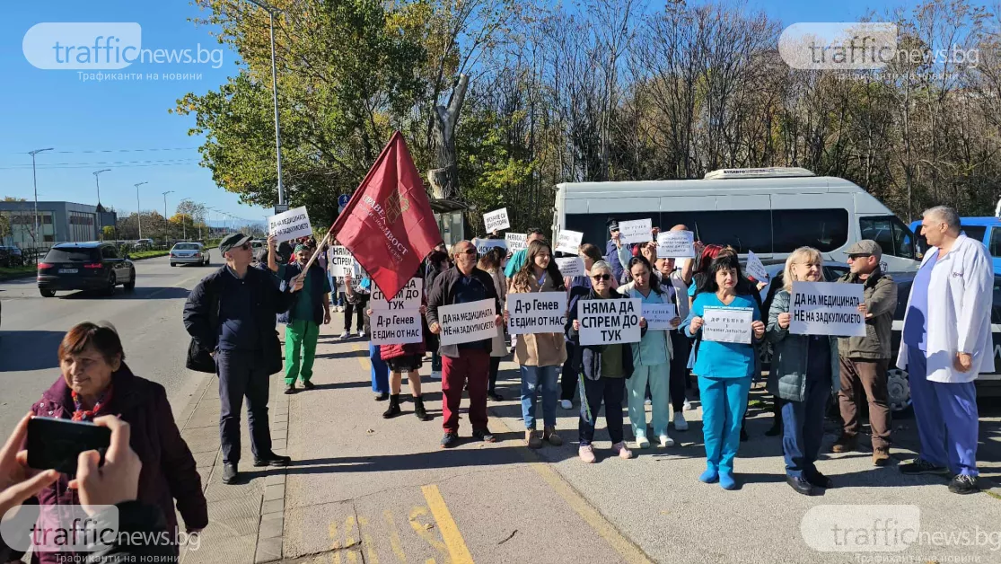 Със викания „ Искаме си шефа ” и плакати „ Д-р Генев е един от нас ” и „ ДА на медицината, НЕ на задкулисието ” медиците от УМБАЛ–Пловдив блокираха за малко кръстовището на бул. „ България “ и ул. „ Дилянка “ в символ на неодобрение от резултатите на състезанието за ново управление на болничното заведение.