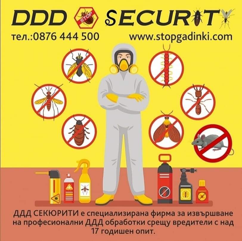 Най-правилното е да се свържете със профилирана компания, която да Ви помогне. ДДД СЕКЮРИТИ е компания за осъществяване на професионални ДДД услуги (ДДД (произлиза от началните букви на думите: дезинфекция, дезинсекция, дератизация и значи група от взаимодопълващи се ограничения за биологична отбрана, които се ползват взаимно, по авансово създаден проект. С тях се доближават следните цели: лимитира се разпространяването на заразните болести, понижава се вероятността от пораждане на болести по хората, домашните животни и полезните растения, намаляват се стопанските загуби, породени от вредители по растенията и неприятели на домашните животни. Това са сложни ДДД обработки за свеждането до най-малък брой вредители (дезинсекция) от един тип, както и унищожаването на патогенни микроорганизми (дезинфекция) и отнасяне за вредни гризачи (дератизация). За дългогодишен резултат се ползва скица за ежемесечно осъществяване на ДДД).