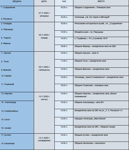 Със свои заповеди регионалният шеф доктор инж. Илия Зюбмилев свика първите съвещания на новоизбраните общински препоръки за мандат 2023 – 2027 година във всички общини от Пловдивска област. Тържествените сесии ще се проведат по график от 7 до 13 ноември.