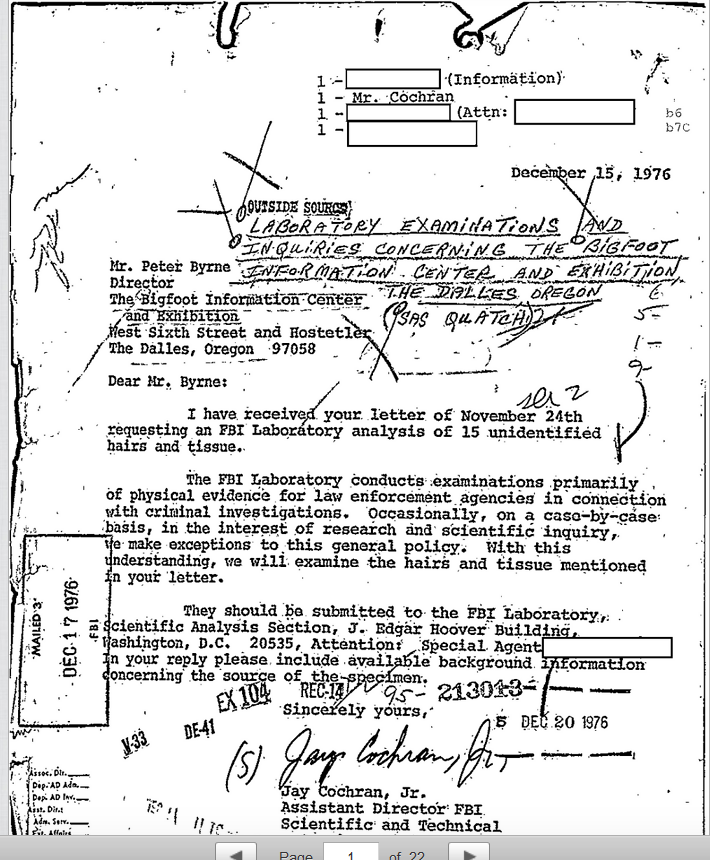 През 1976 година ФБР отваря особено досие, отдадено на косматия хуманоид. До бюрото са изпратени „ материални доказателства “ – към 15 косъма, прикрепени на парче кожа, с молба да бъдат изследвани от тях. Целта била да се удостовери, че те принадлежат точно на мистериозния Йети. Заключението на щатската работа, след направения разбор, е, че „ космите принадлежат на семейство елени “. Но почитателите на сензацията Бигфуут по този начин и не одобряват изказаното мнение. Нещо повече - съгласно тях това е неистина и съзнателно прикриване на истината от страна на управляващите, с цел да се избегне всяването на ужас и суматоха в обществото.
