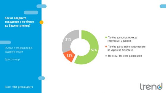 Над половината от пълнолетните български жители (51%) заявяват, че изборите са били почтени и единствено 15% са на противоположното мнение. Очевидно машинното гласоподаване покачва доверието към изборния развой, а и преобладаващото мнение е, че гласуването посредством машина би трябвало да остане (57%). Само 12% са на мнение, че би трябвало да се върне гласуването на хартиена бюлетина.