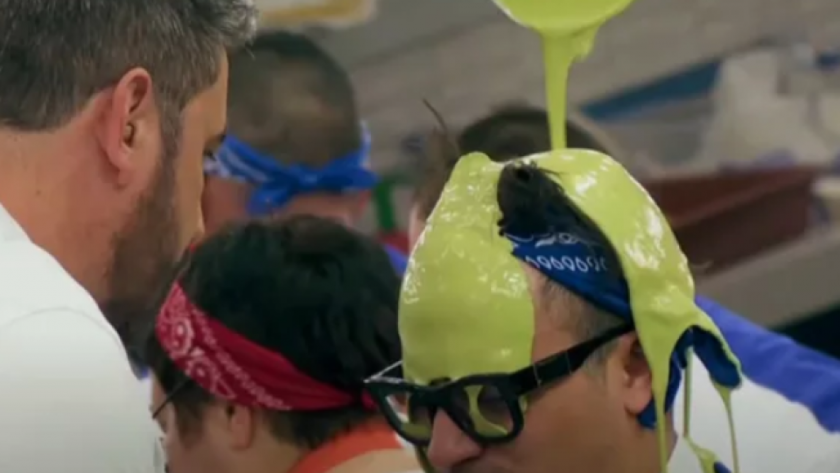 показваща по какъв начин „ ядосаният началник Ангелов изсипва купа със зелен сос върху главата на един от участниците