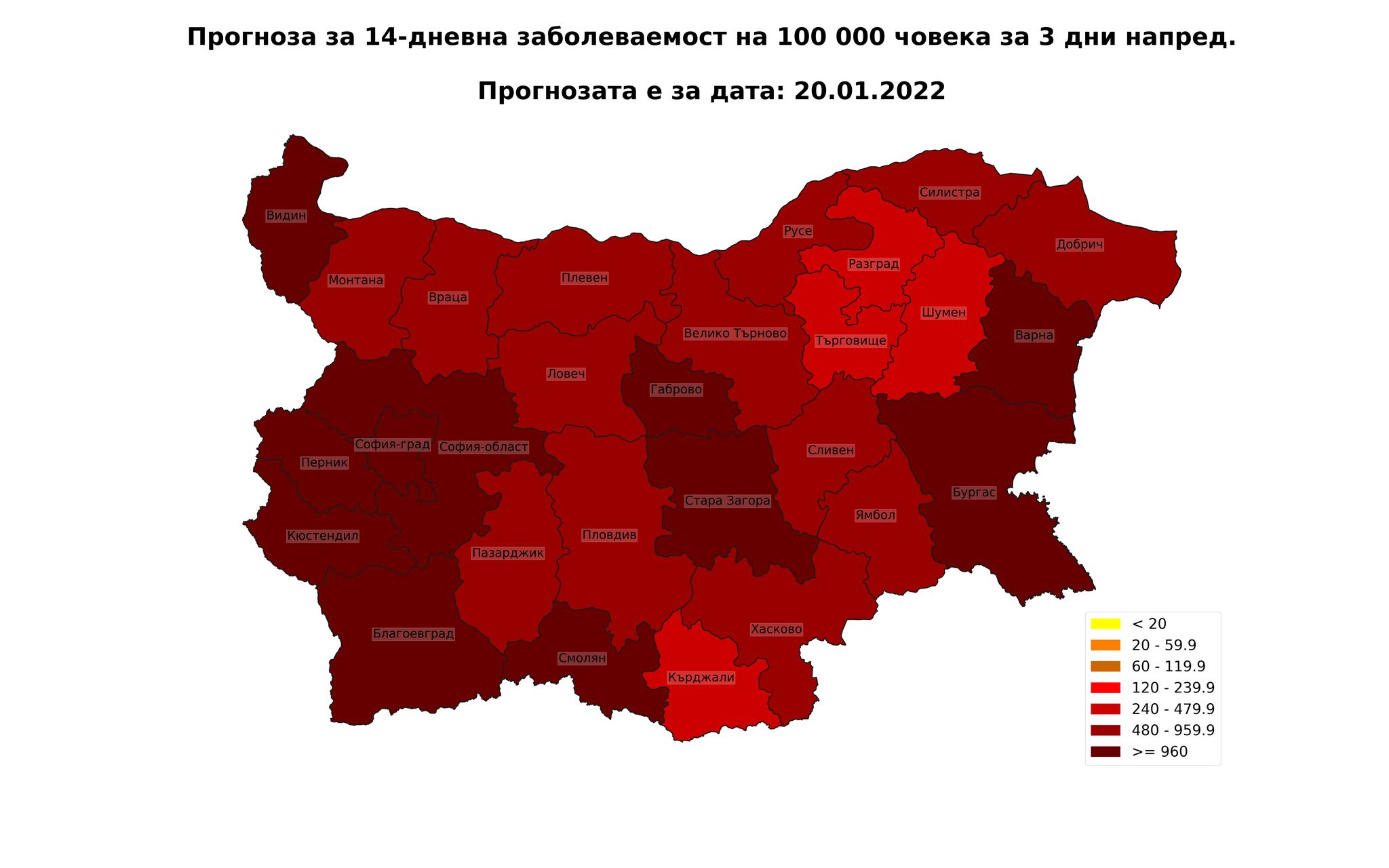 Картата за прогнозата за 14-дневната заболеваемост. Виждат се областите, в които се вихри към този момент Омикронът. Очаква се и други области да влязат в тази най-тъмночервена зона.