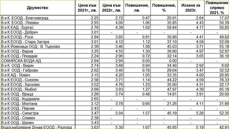 Подобно беше и изявлението и на сътрудника му от КТ Подкрепа. И той лобира за включване на инфлацията от началото на 2021 година в цената през 2023 година, която би добавила някоя и друга стотинка към нарастванията и упрекна КЕВР в съзнателно закъснение по произнасянето за цените на водата, без значение, че главната причина за това бе решението на Парламента за слагането на мораториум върху цената на водата.