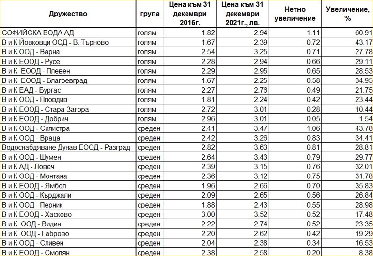 За предходния 5-годишен интервал покачването на цената на водата в бранша е било 27%, до момента в който за интервала 2022-2026г., единствено за първите две години междинната цена на водата в бранша ще се увеличи с над 41%. И всичко това за наша сметка.