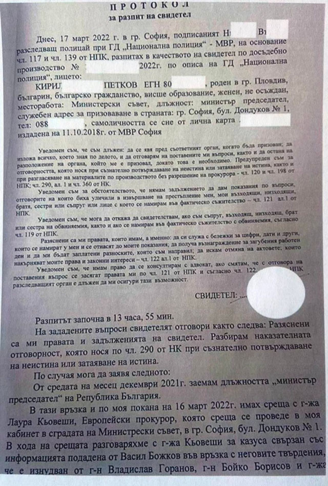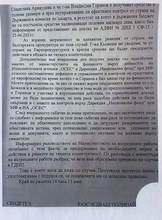 В тази връзка и по моя покана на 16 март 2022 година имах среща с госпожа Лаура Кьовеши, Европейски прокурор, която намира се организира в моя кабинет в постройката на Министерски съвет, гр. София, бул. Дондуков № 1. В хода на срещата разговаряхме с госпожа Кьовеши за проблема обвързван със информация подадена от Васил Божков по отношение на неговите изказвания, че е изнудван от господин Владислав Горанов, господин Бойко Борисов и госпожа Севделина Арнаудова и че г-на Владислав Горанов е получавал средства в огромни размери и посредством неупражняване на ефикасен надзор от страна на Държавна комисия по хазарта, вследствие на което в държавния бюджет не са постъпили средства надвишаващи половин милиард лв., както бях осведомен от показания отчет на АДФИ № ДИД 1 СФ-15/ 25.06.2021 година