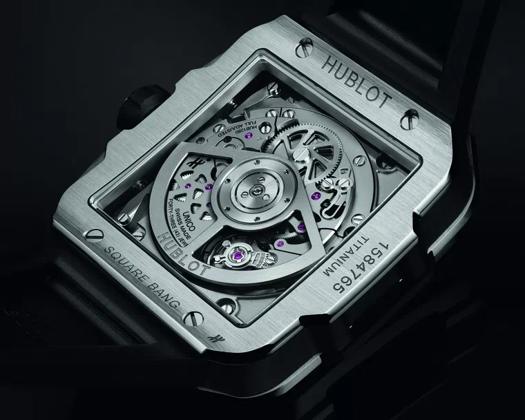 Погледът през транспарантния тил на корпуса разкрива още по-добре създадения от експертите на Hublot автоматизиран диаметър HUB1280 Unico, прочут от моделите Big Bang Unico и Big Bang Integral. Прецизният флайбек хронограф употребява периодичност 28 800 съмнения в час, съдържа 43 камъка и обезпечава 72 часа ходов запас. При Square Bang “All Black ” всички детайли на механизма са изпълнени в черно, наблягайки мистичното влияние на единствената по рода си лимитирана серия.