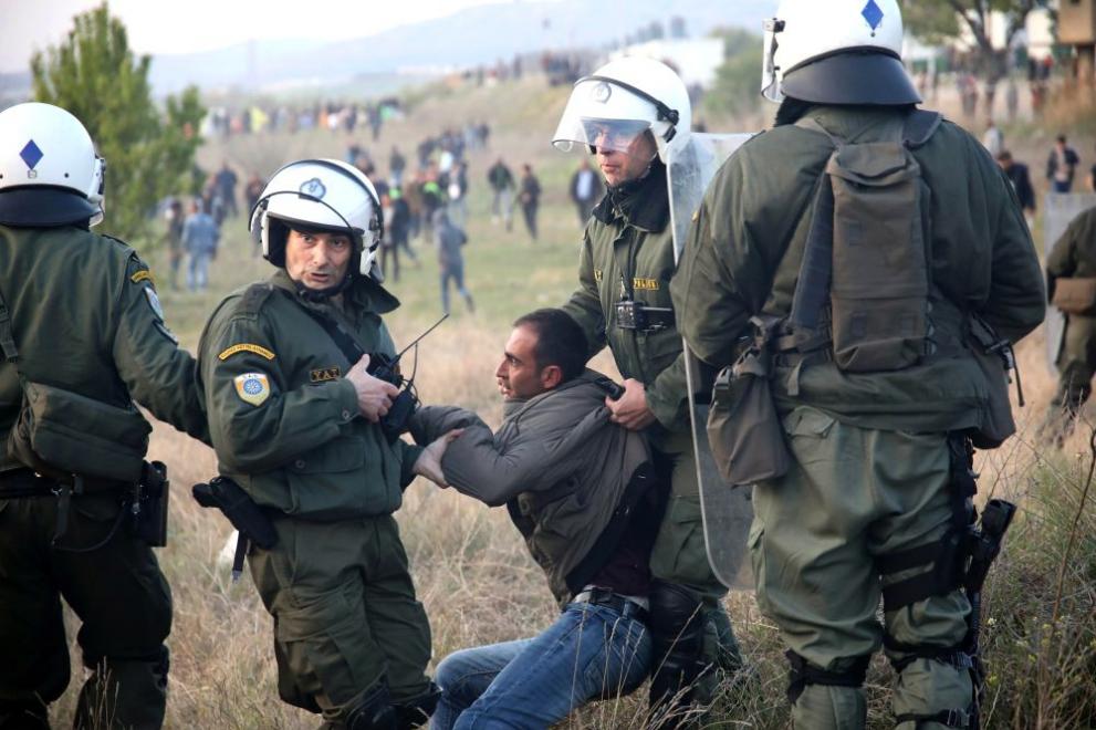 Migrants and refugees, seeking to travel onward to northern Europe, scuffle with riot police officers outside a camp in Diavata in northern Greece. More from the border: