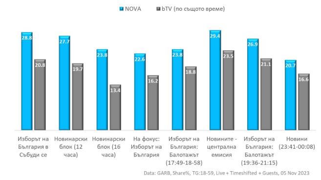 Сблизо 12-часова стратегия, отдадена на втория тур на локалните избори, NOVA притегли най-голямата част от зрителската публика в България. За втора поредна неделя всички излъчвания и вести на медията, отразяващи значимото събитие, са пожеланият източник на информация, разбори и мнения. Според формалните пийпълметрични резултати, аудиторният дял на NOVA измежду феновете в дейна възраст (18-59 г.) е най-голям в изборния ден.