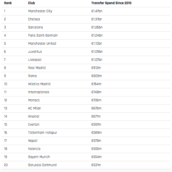 Останалите три тима, надхвърлили границата от 1 милиарда евро, са Манчестър Юнайтед, Ювентус и Ливърпул. Реал Мадрид, които станаха три следващи път носители на Шампионската лига, са похарчили 912 млн. евро за проучвания интервал.