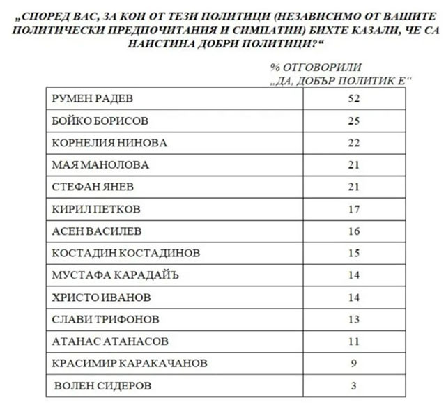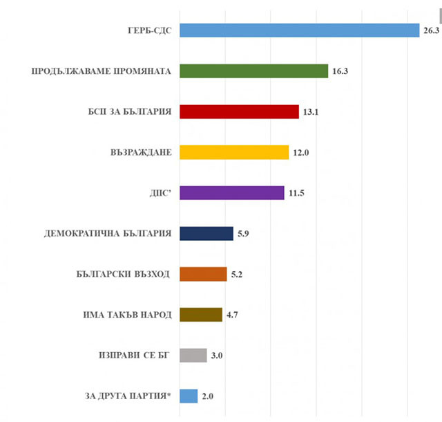 „ Демократична България “ и „ Български Възход “ са устойчиво над 4 %-ната преграда за влизане в Народното събрание. Въпреки, че при „ ИТН “ продължава отливът на гласоподаватели, към този момент те резервират опциите си за посланичество в Народното събрание. Партията на Мая Манолова към този момент е близо, само че под чертата за влизане в Народното събрание, като резервира известни шансове за новия парламент.