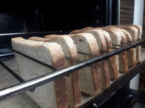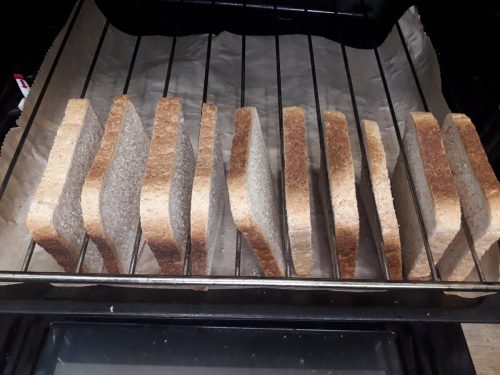 Разбрах, че тази решетка може да размени тостер. Купих изгорял бял самун. Поставих тава малко по-ниско от решетката, покрих я с хартия за печене и пъхнах филии самун сред решетките на решетката. И след към 20 минути извадих същински тост от фурната!