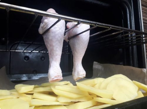 Отдолу би трябвало да поставите и тава за печене или още по-добре с гарнитура от картофи, тъй като те ще поемат капещата лой от бутчетата и ще се получи необикновено вкусно ядене.