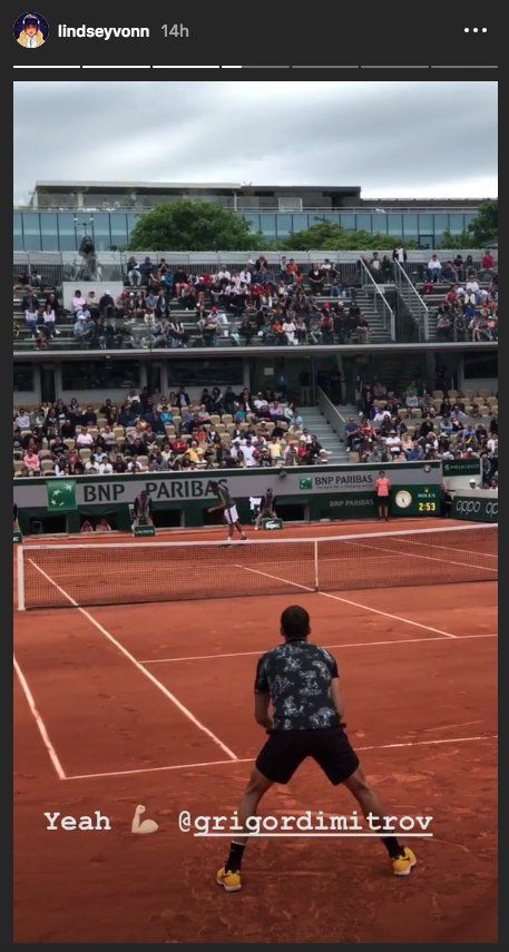 Секссимволът на алпийските ски Линзи Вон наблюдава с интерес вчерашния героичен петсетов триумф на най-хубавия ни тенисист Григор Димитров над Марин Чилич във втория кръг на „ Ролан Гарос “.