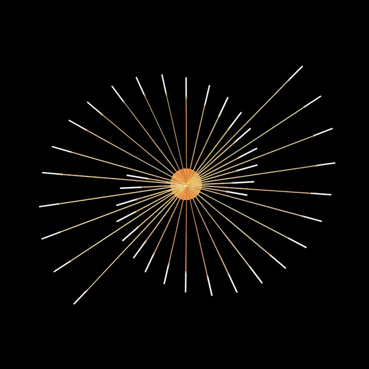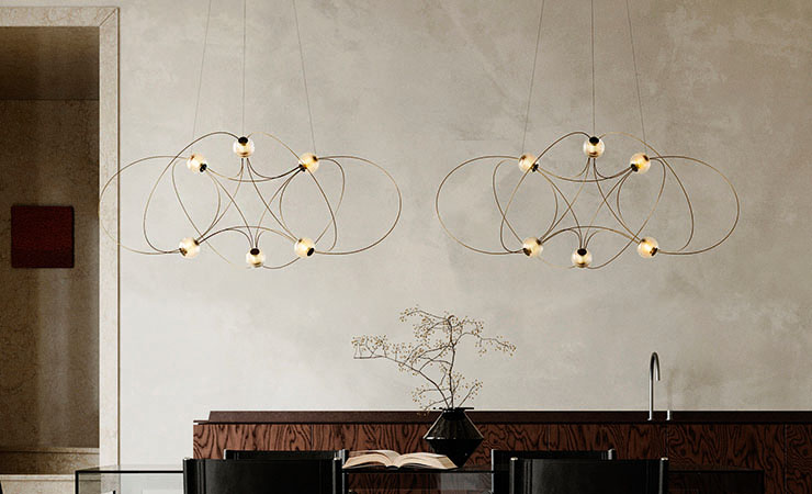 Осветителните тела пък рисуват комплицирани композиции в пространството, напомнящи съзвездия.Тоновете са в сивата гама, от доста ярко съвсем до изцяло прегоряло, а материите са релефни.