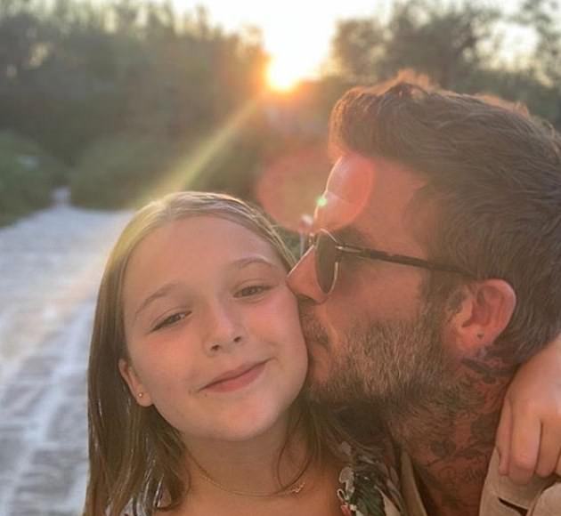 Футболната легенда разгласява фотография, на коятоцелува по бузата щерка си Харпър, до момента в който неговата брачна половинка Виктория си почива интензивно с усмивка на лицето.