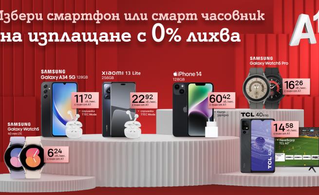 Освен смарт часовниците в селекцията са включени и четири смарт телефона на топ производители. Сред предложенията са iPhone 14, един от най-търсените модели на компанията с отлична продуктивност и изключителна камера. Устройството може да бъде закупено в комплект с автентично зарядно и проект Unlimited Ultra на погашение без оскъпяване за 60,42 лв. на месец.