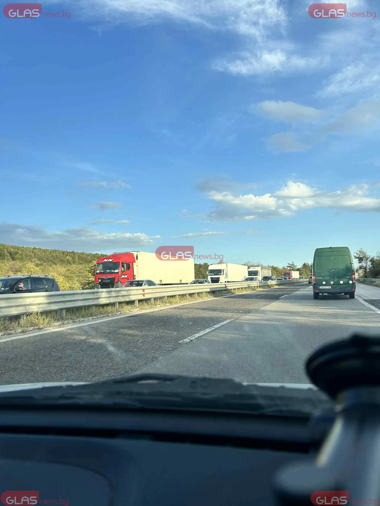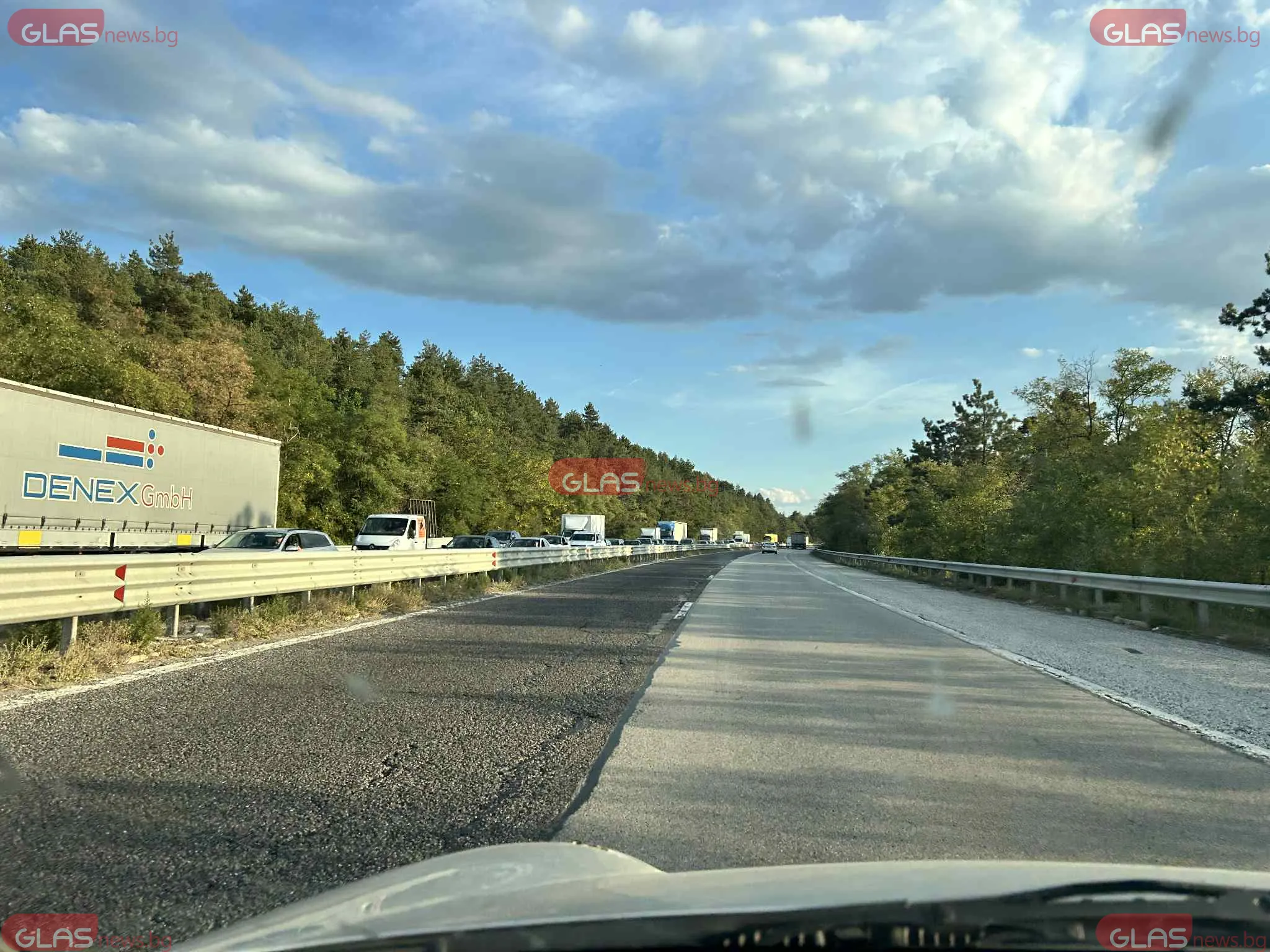 Опашката от коли стартира от 33-ия километър на автомагистралата и доближава до 41-ия км, съобщи читател на GlasNews.bg.
