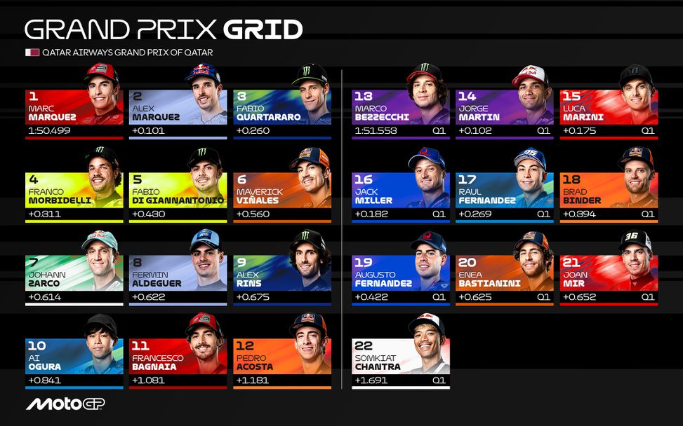 До него на първата редица ще се наредят брат му Алекс и Фабио Куартараро, за който това е първи старт от първата редица от Гран При на Нидерландия през 2022 година насам. Соченият за огромен любимец преди началото на уикенда в Близкия изток Франческо Баная ще би трябвало да започва едвам 11-ти след рухването си в квалификацията през вчерашния ден. Световният първенец Хорхе Мартин ще потегли от средата на петия ред при своето завръщане в MotoGP.