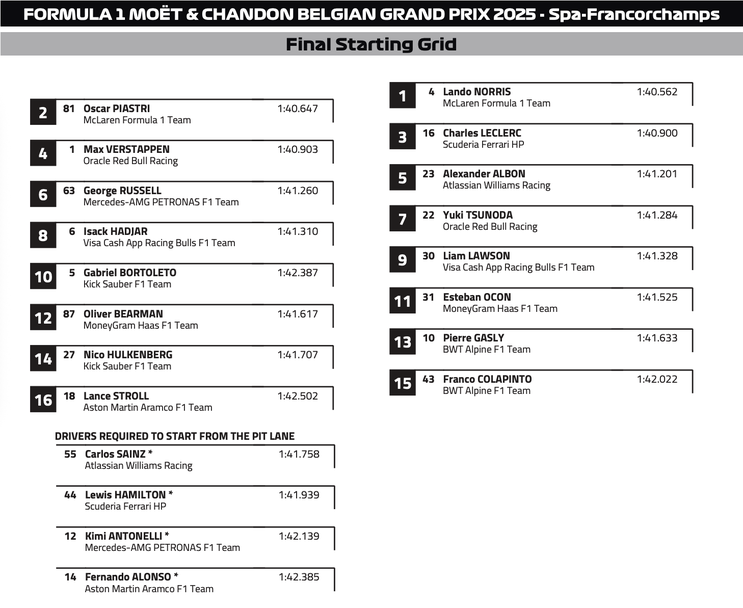 Сезон 2025 във Формула 1 продължава с една от най-големите класики въобще в международния шампионат – Гран При на Белгия от митичната писта „ Спа “. От полпозишъна през днешния ден в Ардените ще потегли Ландо Норис, който ще раздели първата редица със своя съотборник Оскар Пиастри.