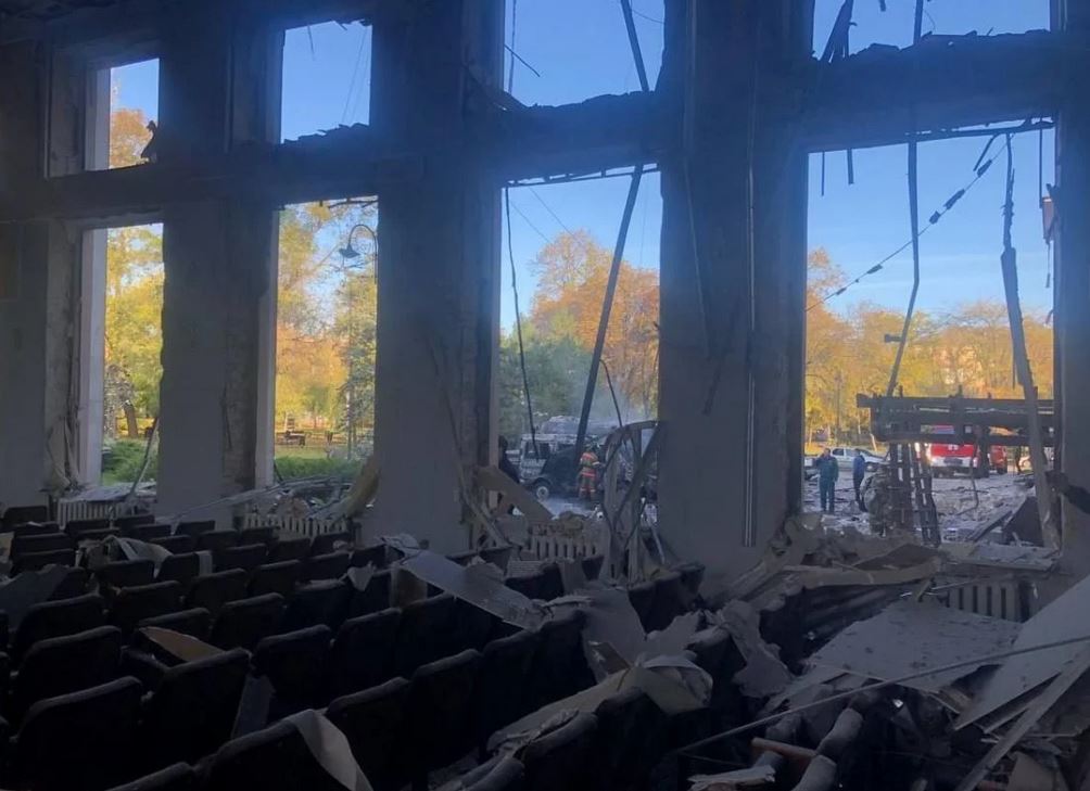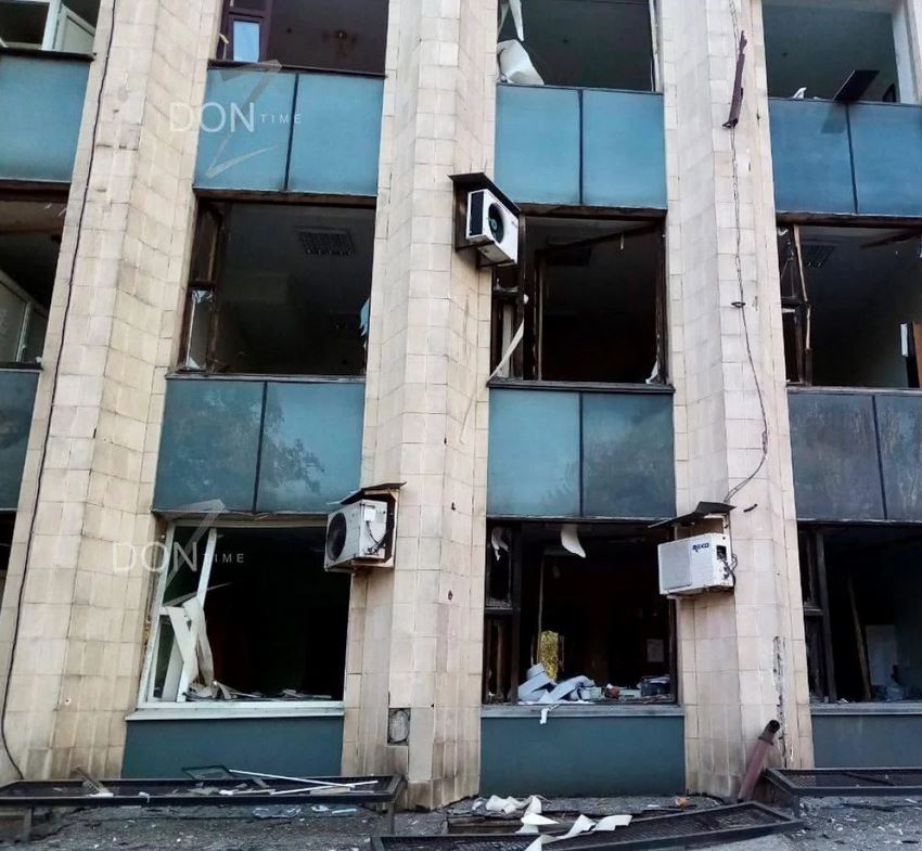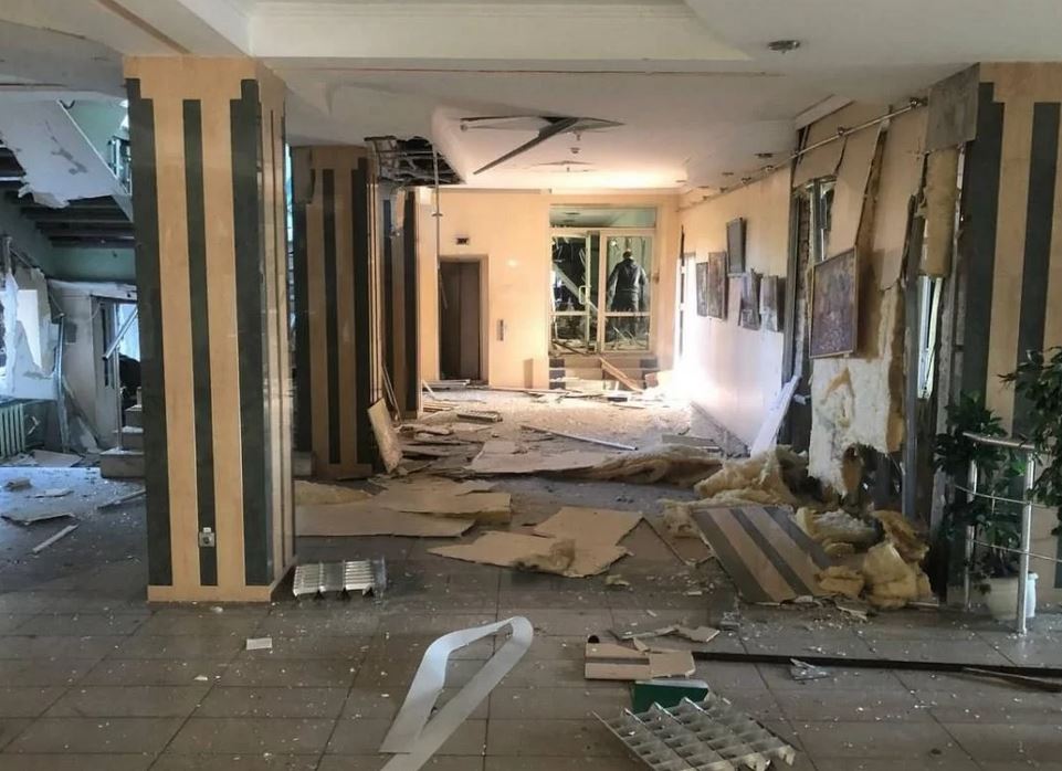 Повреден е основният вход на постройката, унищожени са и няколко автомобила покрай зданието, посочи в канала си в " Телеграм " градската администрация.
