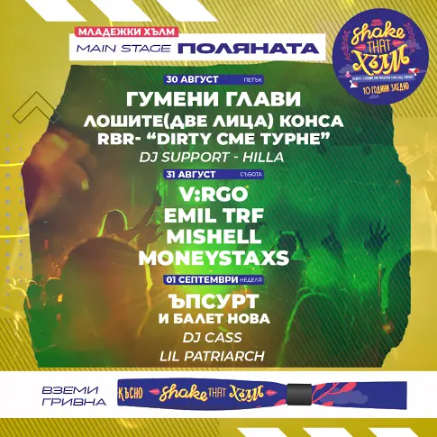 Shake That Хълм стартира през днешния ден в Пловдив с стратегия на 6 подиуми, 80 часа музика и ВХОД СВОБОДЕН! Фестивалът отбелязва своето десето издание, а уредниците са селектирали ТОП реализатори. От дребен градски фестивал с една съществена и една дребна акустична сцена, през днешния ден “Shake That Хълм ” се радва на многохилядната си аудитория и предлага разнообразна стратегия, която с изключение на богато музикално наличие, включва голям брой улични изкуства, break dance батъли, графити зона, цирково изкуство, Shake Market - базар с ръчно творчество, лунапарк, арт работилници и ателиета, зона за хамаци, игри и несъмнено вкусна храна и многообразие от свежи питиета.