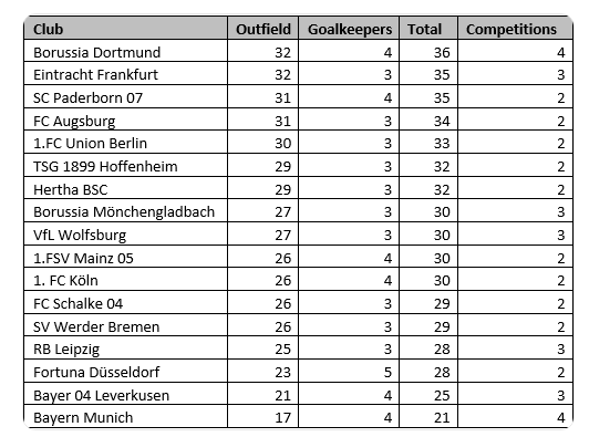 В същото време считаният за главен съперник Борусия (Дортмунд) е отборът с най-вече футболисти - 36.