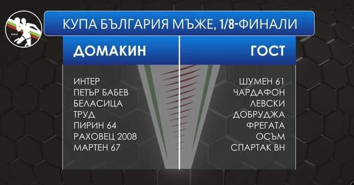 Шампионът на България по хандбал за мъже Шумен 61 ще стартира присъединяване си в шампионата за Купата на България с посещение на Интер. Това дефинира жребият за 1/8-финалите. Мачовете от тази фаза ще се играят на 12 и 13 ноември.