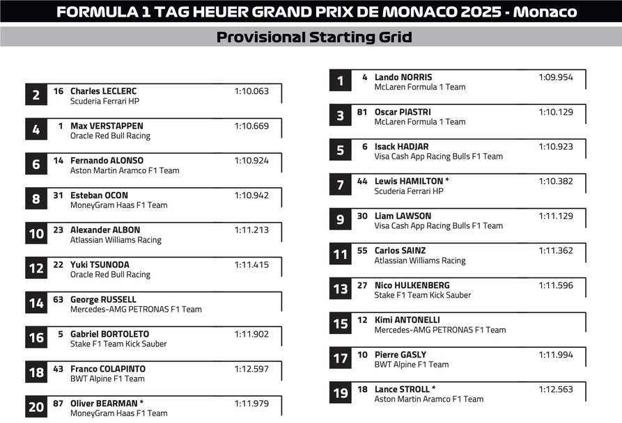 Монегаскът не съумя да завоюва за четвърти път квалификацията в Княжеството и ще потегли от втората позиция на стартовата решетка зад Норис, който ще започва от полпозишъна. Лидерът в шампионата Пиастри ще заема третата позиция на стартовата решетка, а компания на втората редица ще му прави настоящият първенец Макс Верстапен.