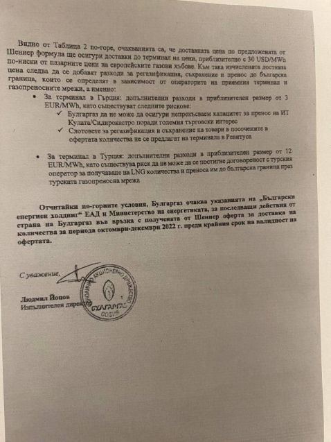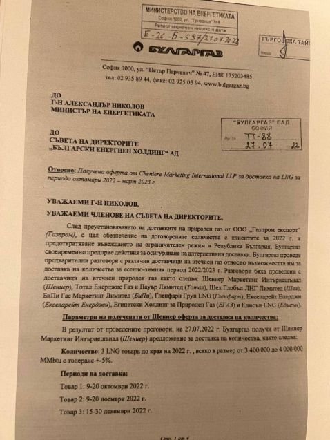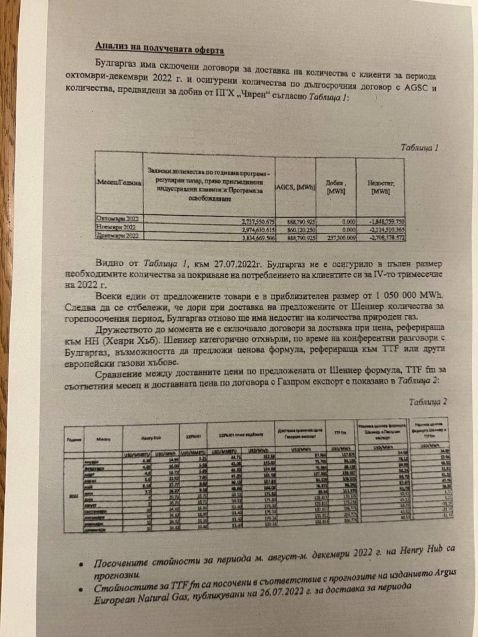 Медията разгласява с документа и с следващ разбор на " Булгаргаз " по отношение на доставките на природен газ за страната, които са извънредно незадоволителни даже с прословутите 7 танкера с полутечен газ, които Кирил Петков шумно анонсира на последното съвещание на Министерския съвет.