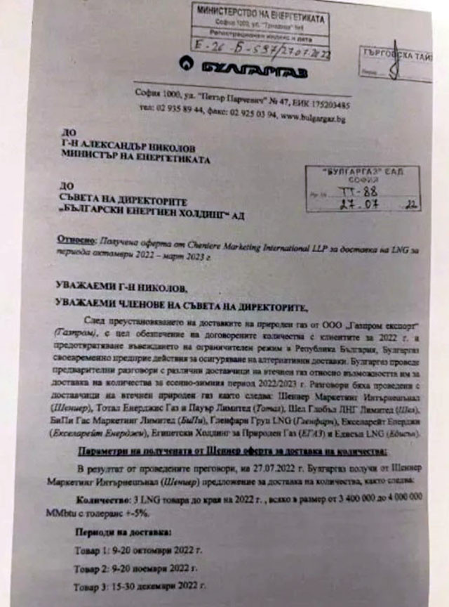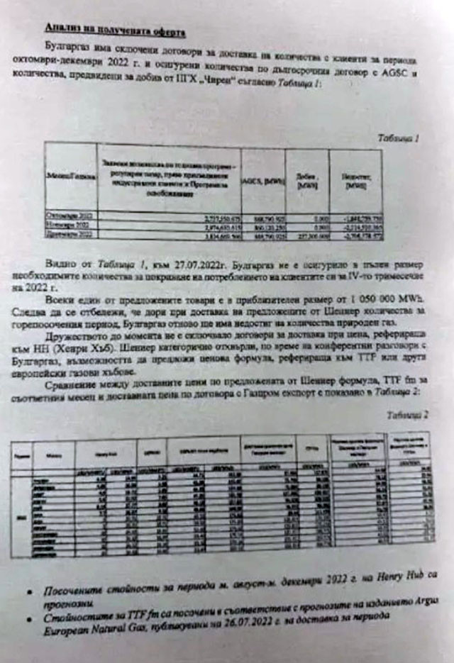 Медията разгласява документа и с следващ разбор на " Булгаргаз " по отношение на доставките на природен газ за страната, които са извънредно незадоволителни даже с прословутите 7 танкера с полутечен газ, които Кирил Петков шумно анонсира на последното съвещание на Министерския съвет.