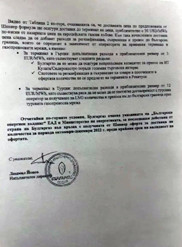 От писмото до министерството на енергетиката и БЕХ излиза наяве още, че втечнения газ с танкерите е оферта от компанията Cheniere Marketing International LPP. Изпълнителният шеф на " Булгаргаз " ползва и сравнителна таблица на цените, от която се вижда, че газът по контракта ни с " Газпром Експорт " ще е по-евтин.