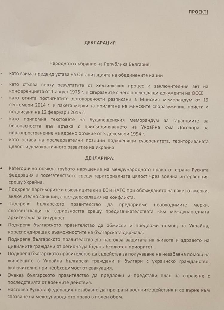 Иначе декларацията на депутатите по план осъжда нарушаването на интернационалното право от страна на Руската федерация и похищението против териториалната целокупност на Украйна. Освен това поддържа сътрудниците и съдружниците си в Европейски Съюз и НАТО за приемането на пакет от ограничения, в това число налагането на наказания против Русия, както и изисква представянето на проект от Министерския съвет за справяне с следствията, като подсигурява незабавна помощ на българите в Украйна. В декларацията се упорства Русия да приключи неотложно военните дейности и да се върне към интернационалното право в цялостен размер.
