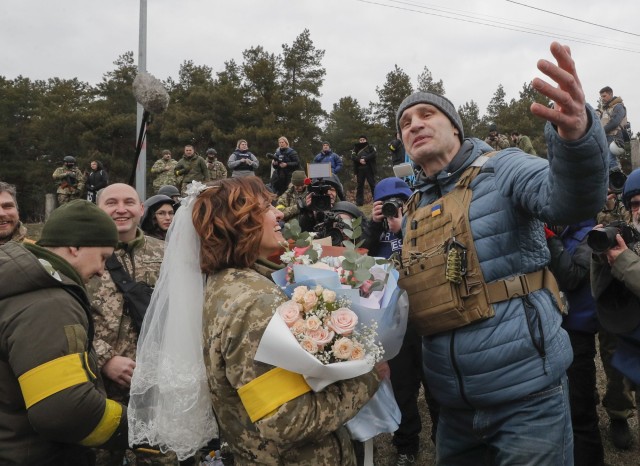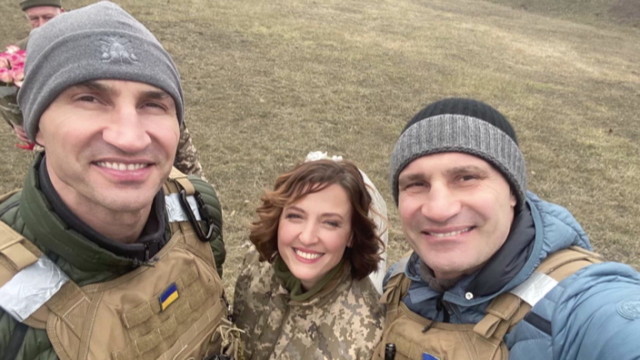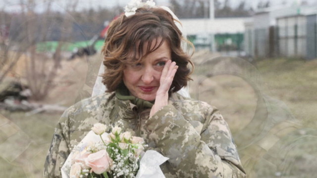 Шести март. Киев. На фронта. Във военна униформа вместо в булчинска рокля. С каски, вместо с венци. Свещеник с бронежилетка, вместо в църковни одежди. Така наподобява любовта по време на война.