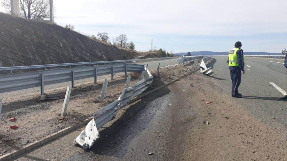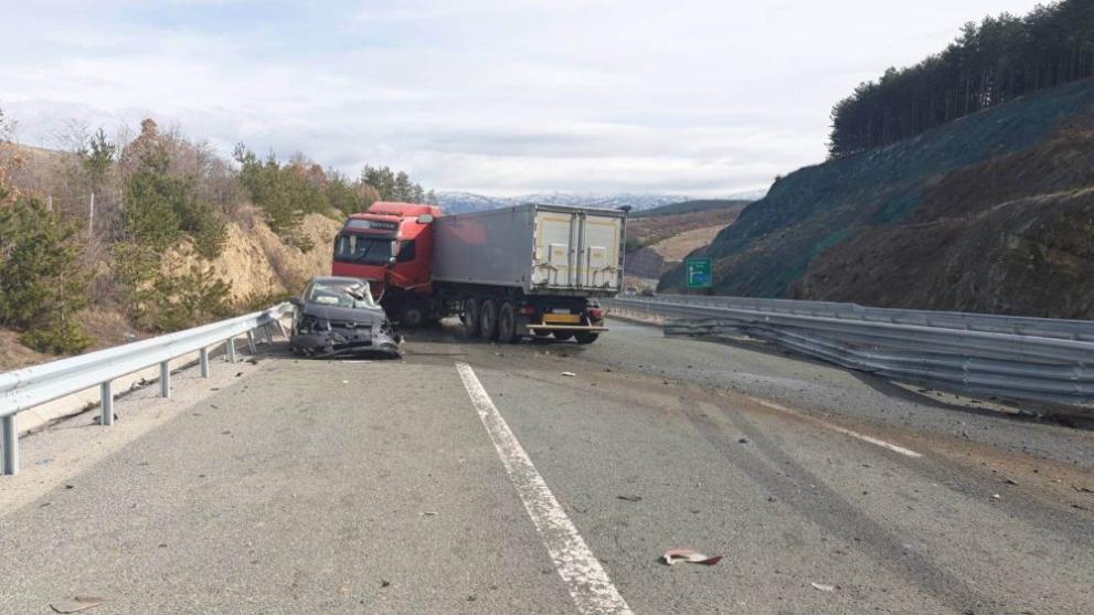 Тир спука гума при изпреварване и удари кола на АМ „Струма“, пострадаха двама души