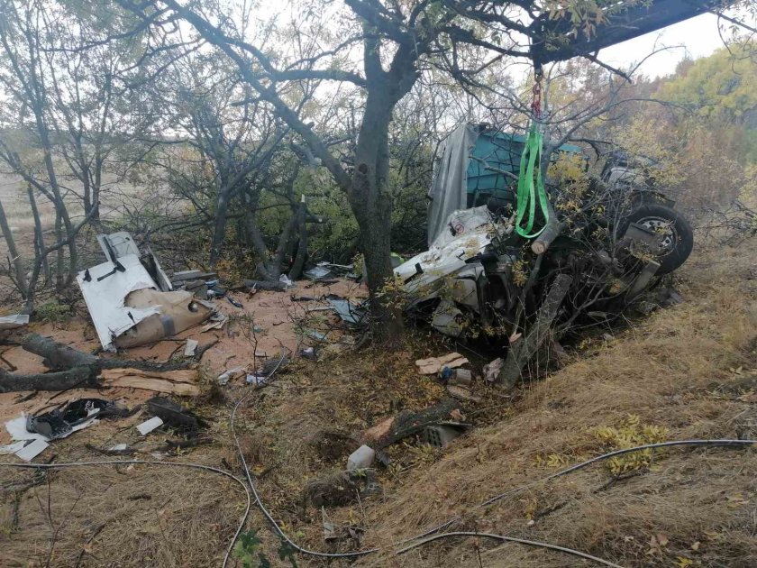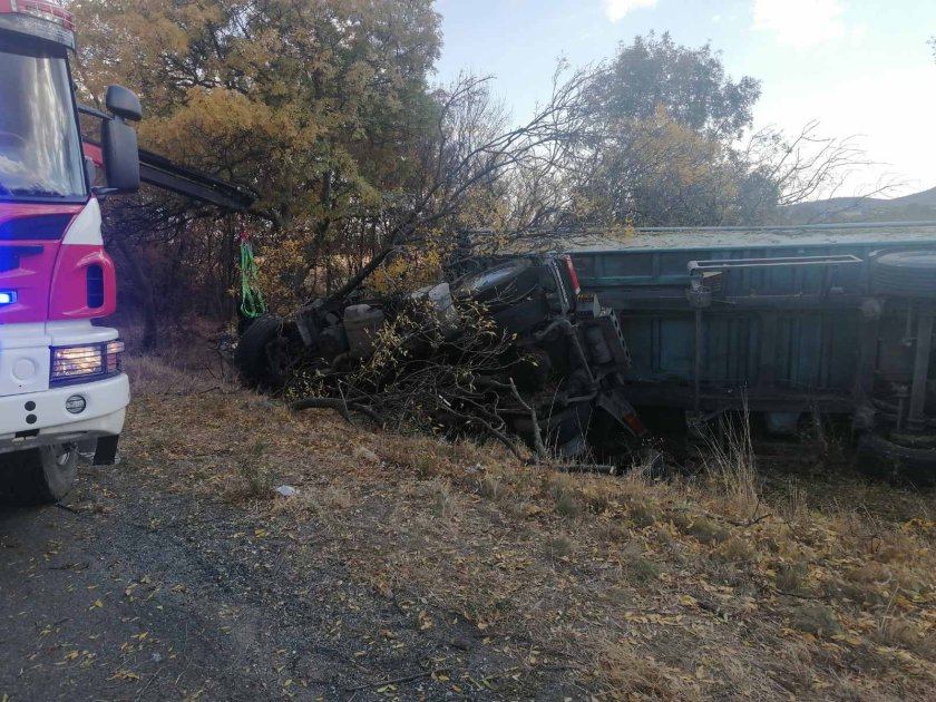 Тежкотоварният автомобил се е движел по надолнището, когато 41-годишният лидер от карнобатското село Крумово градище евентуално не е съумял да го овладее. Превозното средство се е обърнало отвън пътното платно.