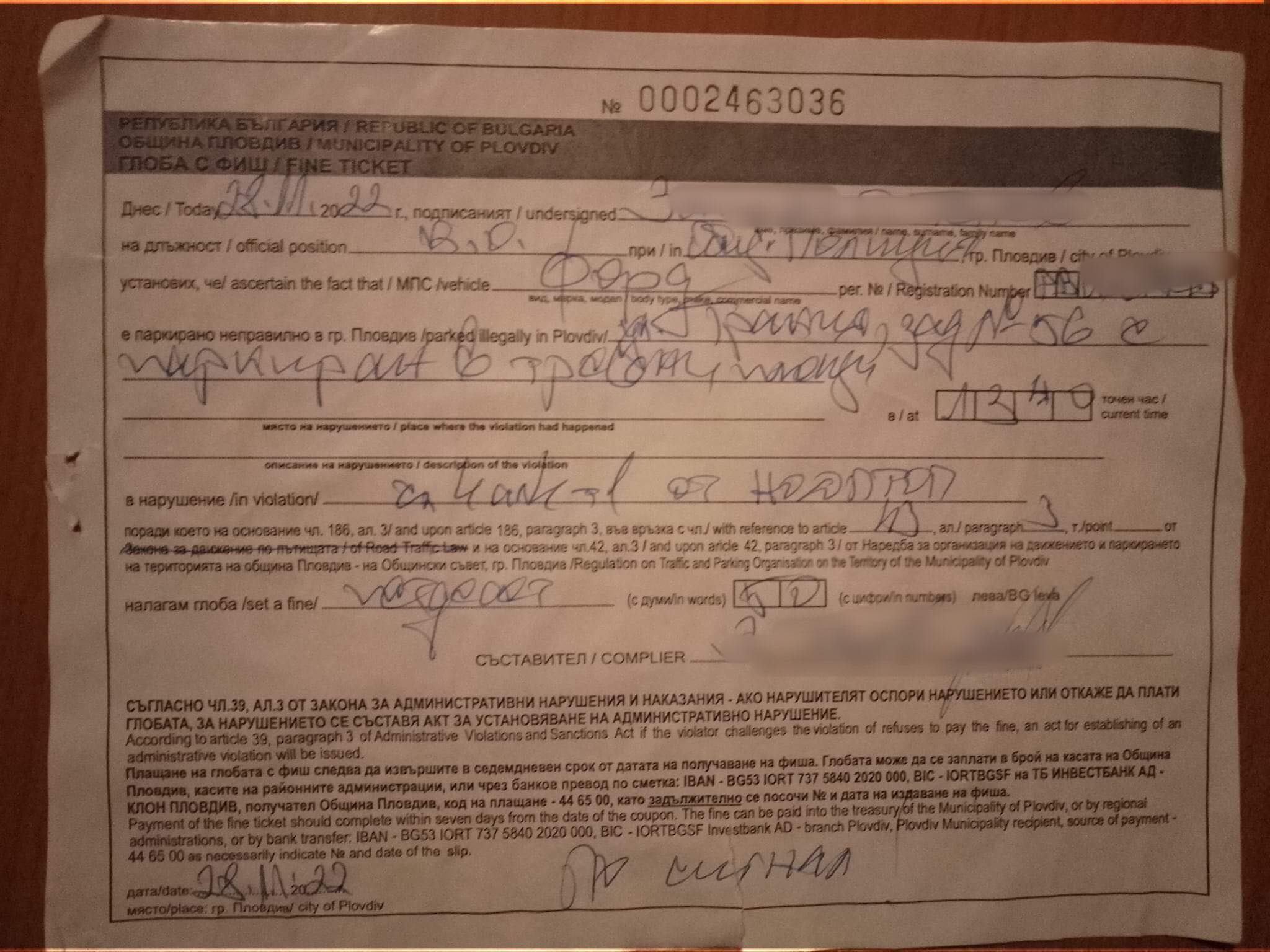 Шофьор от Пловдив е забелязал неточност в попълването на фиш, с който е санкциониран за паркиране в тревни площи край Централна гара. Той самият признава, че нарушил разпоредбите, само че ден по-рано, а не в посочонето време на фиша.