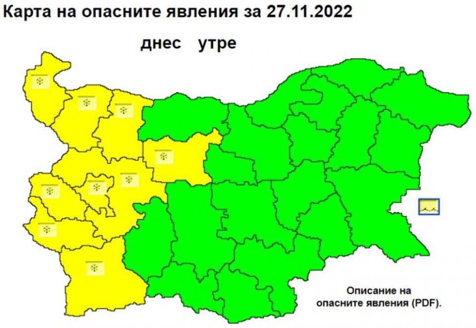 т Националния институт по метеорология и хидрология предизвестяват за евентуално рисково време на 27 ноември, като жълт код е разгласен за девет области: Благоевград, Видин, Враца, Кюстендил, Ловеч, Монтана, Перник, София-град и София Област.