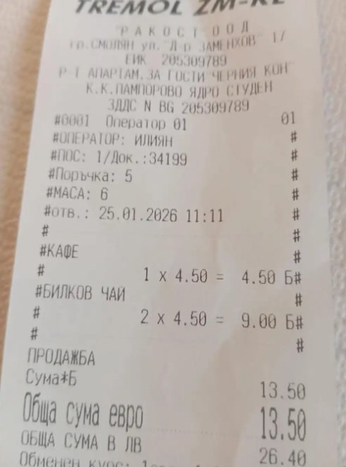 Шокирана от цените в Пампорово дама показа, че нейни другари са платили 13,50 евро (26,40 лв)... за два чая и едно кафе. И направи извода - у нас несъмнено е по-скъпо, в сравнение с в топ курорти от Европа.