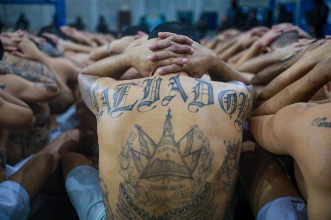 На фотосите се виждат голи до кръста и мощно татуирани пандизчии, подредени под зоркия взор на въоръжени пазачи в Центъра за задържане на терористи (CECOT) - оборудване с оптималната степен на сигурност, издигнато в Теколука, с цел да бъдат затваряни най-жестоките и високопоставени членове на главните банди в страната - MS-13 и Barrio 18.