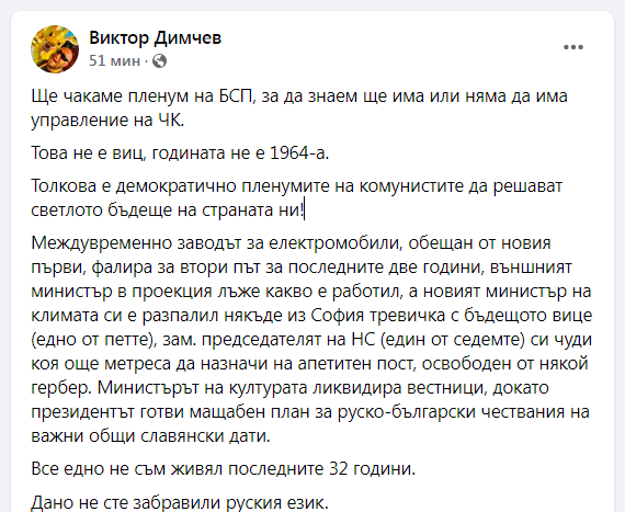 Ще чакаме пленум на Българска социалистическа партия, с цел да знаем ще има или няма да има ръководство на ЧК. Това не е анекдот, годината не е 1964-а. Толкова е демократично пленумите на комунистите да вземат решение светлото бъдеще на страната ни! Това разяснява на страницата си във Facebook анализаторът Виктор Димчев.
