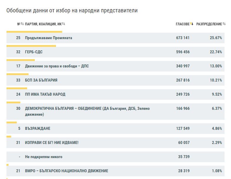 Политическата групировка, отпред с Кирил Петков и Асен Василев - " Продължаваме Промяната ", пък печели предварителните парламентарни избори. Това сочат окончателните данни на ЦИК при обработени 100% от протоколите.