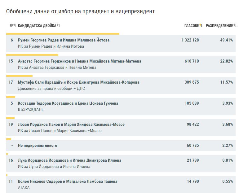 Ще има балотаж за президент сред Румен Радев и Анастас Герджиков. За кандидатската двойка Румен Радев - Илияна Йотова са подадени 1 312 261 глас, или 49,45 на 100 от всички гласове.
