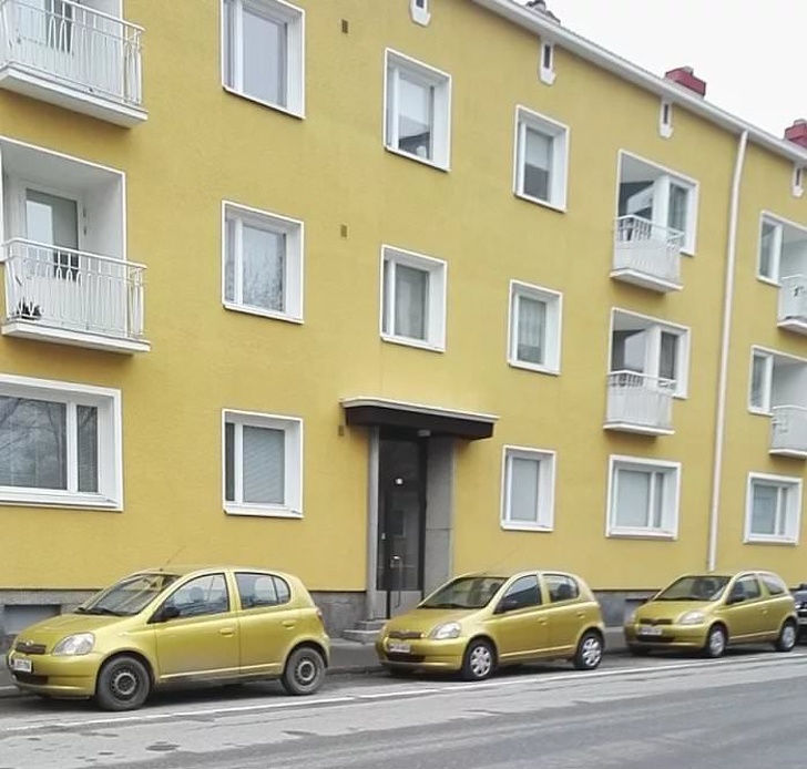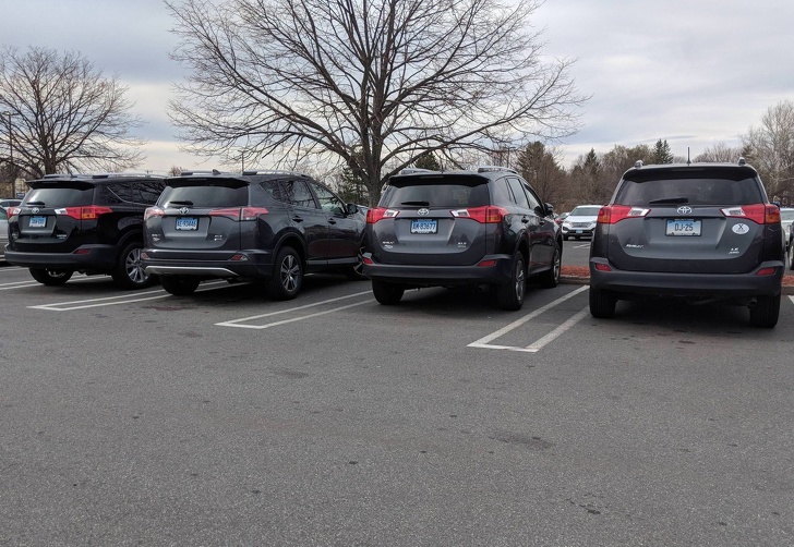 20. Четири идентични коли паркирани наоколо до магазин за хранителни артикули.