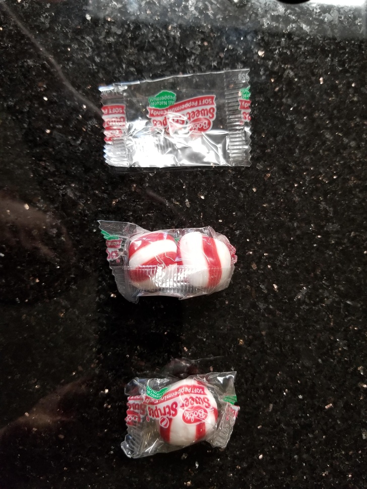 19. Празна опаковка от бонбон, която би трябвало да е цялостна, два бонбона, опаковани дружно, и една естествена опаковка с бонбон – опакован по този начин, както би трябвало да бъде.