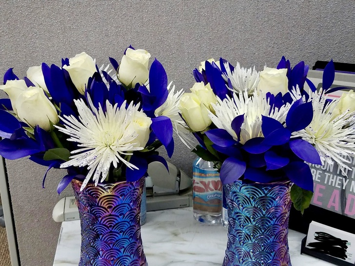 4. Моята другарка и сестра й подариха на майка си идентични букети. Дори вазите съответстваха.