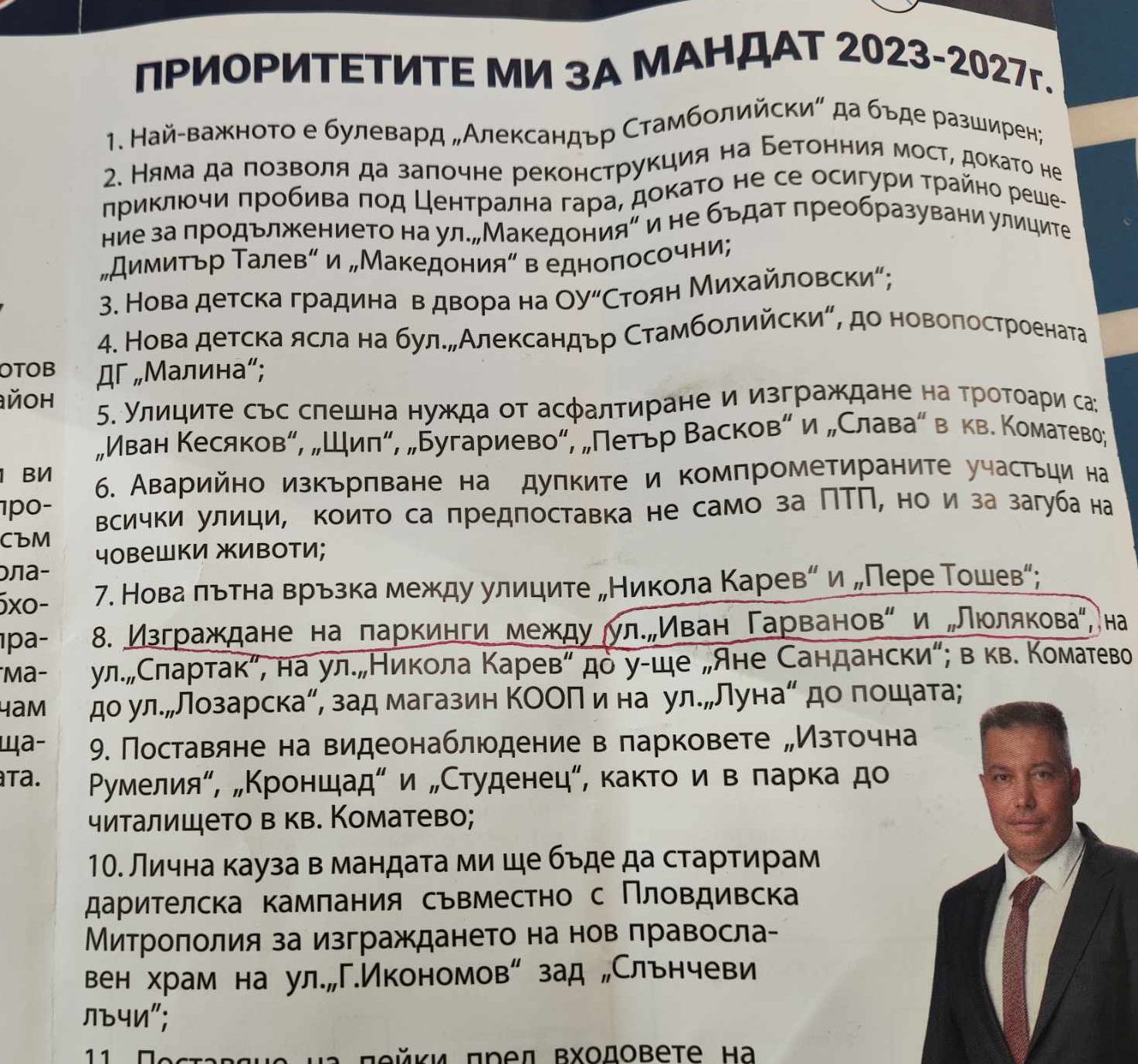 Притеснените поданици са се свързали с Дафинка Иванова, откакто са видели брошурата на Васко Вътев и програмата му за развиване на региона. В нея записано, че ще се построява паркинг на ул. „ Иван Гарваново ” и ул. „ Люлякова ”. Единственото място, където подобен може да бъде издигнат е спортното игрище, което бе облагородено от жителите в региона и гражданското съдружие „ Браво, Пловдив ”.