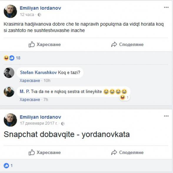 Самият Емилиян е схванал за поста по негов адрес във Фейсбук, който Хаджииванова пусна и иронично разяснява обстановката в един от Фейсбук профилите си (бел. ред. – непокътнат е истинският език, правопис и граматика) по този начин: " Krasimira hadjiivanova dobre che te napravih populqrna da vidqt horata koq si zashtoto ne sushtestvuvashe inache ".
