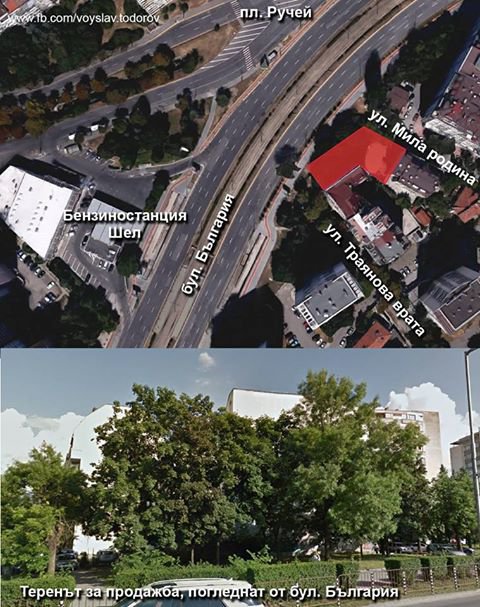 " Общината се готви да продаде терен за нов небостъргач (в червено) в съседство на 43-етажната постройка на бул. " България ". Законът разрешава на ъглов парцел в такава зона (Смф) да се строи без ограничаване във височина и компактност. В момента теренът е зелена повърхност с 6 дървета и паркинг в съседство.