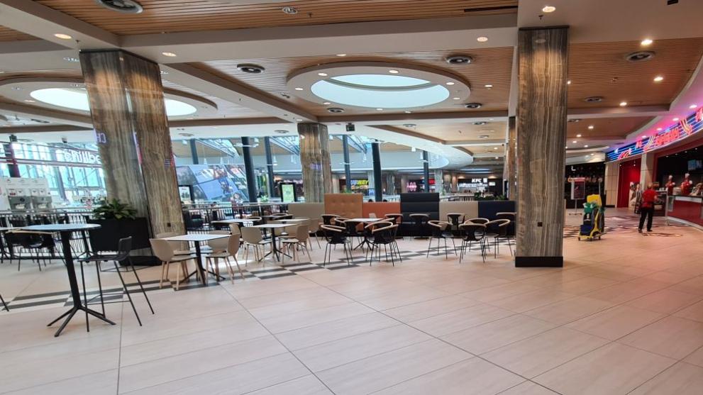 Двайсет минути след 17 часа комерсиалният център работи, магазините работят, само че из коридорите се носи миризма на изгоряло.